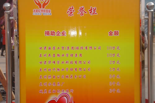 2012元月6日下午3時(shí),甘肅國(guó)芳集團(tuán)聯(lián)合城關(guān)區(qū)皋蘭路街道黨工委、辦事處舉行了“創(chuàng)先爭(zhēng)優(yōu)、扶貧濟(jì)困”太陽(yáng)花幫扶基金啟動(dòng)儀式,充分體現(xiàn)民生為本的服務(wù)宗旨,著力搭建社會(huì)幫扶救助平臺(tái),切實(shí)解決弱勢(shì)群體實(shí)際困難,促進(jìn)和諧街道建設(shè)。