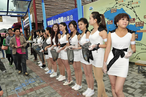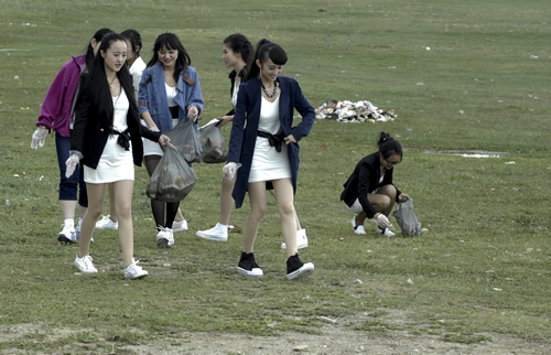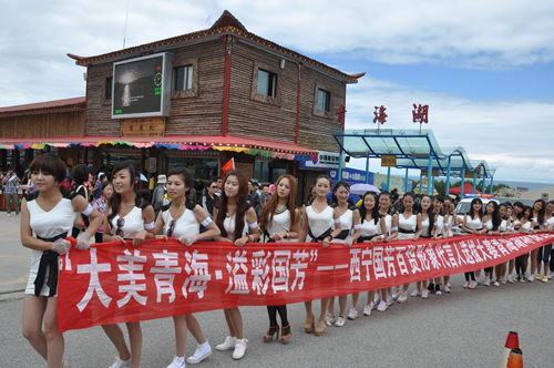 中午,一行到達青海湖畔。天高地闊的美景與靚麗的美女即刻構(gòu)筑成為一道精彩的風景,隨行攝影師、攝像師即刻拿起機器留下許多難得的好畫面。接下來的環(huán)保實踐與環(huán)保意識推廣為眾多選手留下了深刻的印象,許多選手紛紛表示希望通過自己的行動提高社會環(huán)保意識,讓跟多人參與到保護青海湖環(huán)境中來。