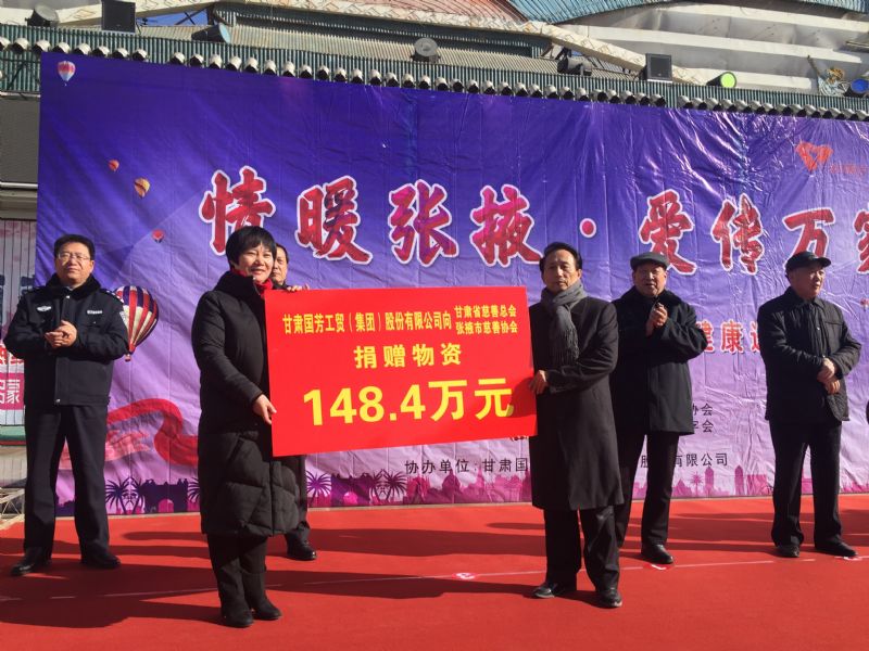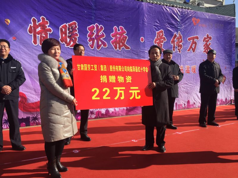 2019年1月11日,甘肅省慈善總會(huì)、張掖市慈善協(xié)會(huì)、甘州區(qū)慈善協(xié)會(huì)以及臨澤縣紅十字會(huì)攜甘肅國(guó)芳工貿(mào)(集團(tuán))股份有限公司在張掖市中心廣場(chǎng)共同舉行“情暖張掖·愛(ài)傳萬(wàn)家”送健康送溫暖活動(dòng),將2000套棉衣,2000余套秋衣秋褲,27臺(tái)彩電以及300余件小家電合計(jì)價(jià)值148萬(wàn)元的過(guò)冬物資帶給山丹縣,民樂(lè)縣的困難群眾,將2500個(gè)醫(yī)藥箱帶給臨澤縣的老人們。此次活動(dòng)傳導(dǎo)社會(huì)幫扶、精準(zhǔn)扶貧精神的同時(shí)也默默為社會(huì)傳導(dǎo)著一份正能量。