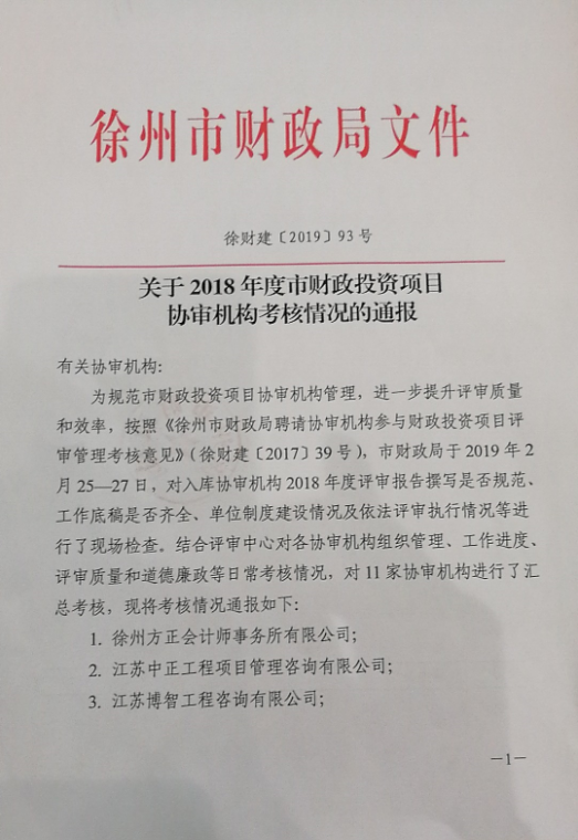 我所榮獲徐州市財政局入庫協(xié)審單位評比第一名
