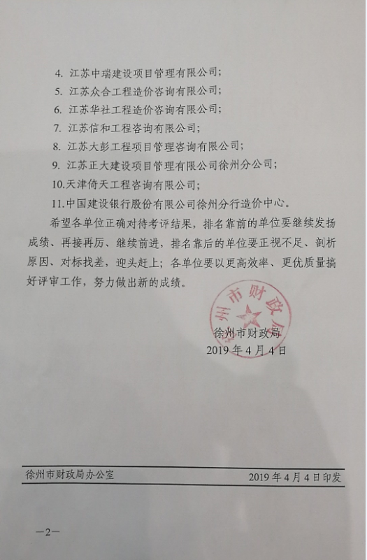 近日,由徐州市財政局組織的協(xié)審單位評比中,我所憑借自身在組織管理、工作進度、評審質(zhì)量、道德廉政等方面的優(yōu)異表現(xiàn),榮獲本次評比第一名的好成績。